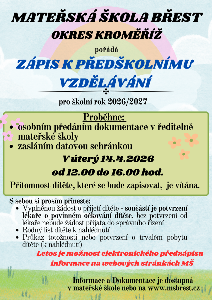 Zápis k předškolnímu vzdělávání pro školní rok 2026/2027